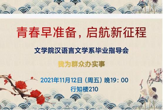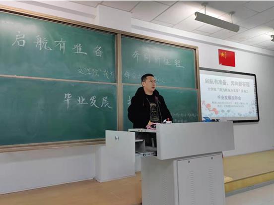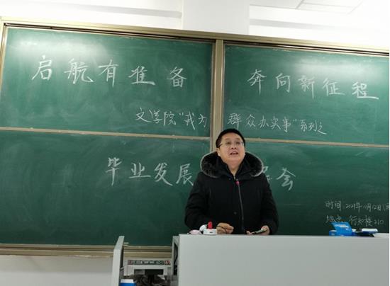 2021年11月13日,565net必赢官网在盛乐校区行知楼210召开了主题为“启航有准备,奔向新征程”的毕业生发展指导会。本次会议由汉文系、汉语系、教务办共同举办,教工一支部书记刘伟博士、汉语言文学系副主任胡素莲博士、教务办公室吴永盛老师出席了会议,汉文系、汉语系、秘书系全体毕业生共300余人参加了会议。