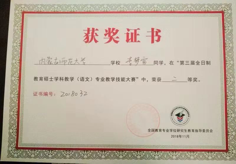 11月16-19日,由全国教育专业学位研究生教育指导委员会、全国高等教育学会语文教育专业委员会、江西师范大学联合主办的第十八届中国高等教育学会语文教育专业委员会年会暨第三届全国教育硕士学科教学(语文)专业教学技能大赛(决赛)”在江西师范大学举行。565net必赢官网学科教学(语文)专业研究生张丹、李梦雪代表我校参加了本次比赛。经过层层选拔,激烈角逐,最终,张丹、李梦雪从120名参加决赛的选手中脱颖而出,分别获一等奖、二等奖。这充分展示了565net必赢官网研究生扎实的专业知识和高水平的教学技能水平,同时,也在全国性大赛中展现了565net必赢官网研究生的风采。565net必赢官网教师徐雪梅、郭亚明被大会评为“优秀指导教师”,565net必赢客户端获得“优秀组织奖”。