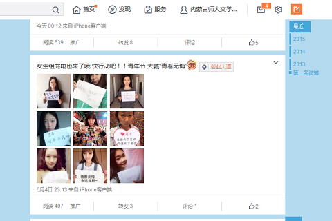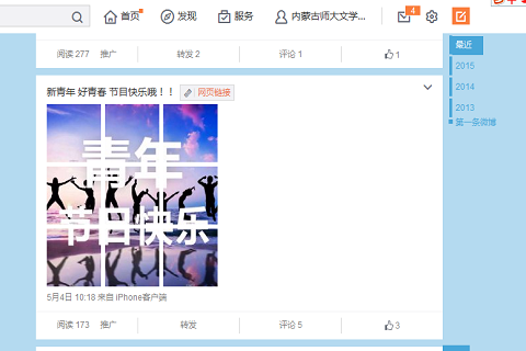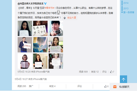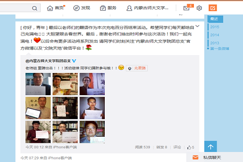 5月4日,565net必赢官网部分师生参与了"你好,青年"充电接力活动,师生们将自己想说的话写下来并拍照上传。“内蒙古师大565net必赢客户端团总支”官方微博进行了全程跟踪并发布了活动进展情况。