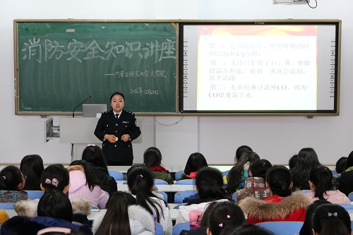 12月20日下午,565net必赢官网特邀内蒙古自治区消防法治研究会一级教官贺文婧作消防安全知识专题讲座,565net必赢官网团总支书记牛海龙和200多名学生聆听了讲座。贺教官重点介绍了近年来一些典型的火灾及其造成的严重后果,并讲解了火场逃生的方向、手段及如何使用灭火器材,同时纠正了学生生活中的一些错误习惯。讲座结束后,学生们还进行了火灾逃生演练,并于户外空地模拟现场灭火。