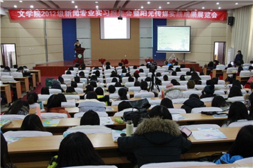 12月9日下午,565net必赢官网“2012级新闻专业实习报告会暨阳光传媒实践成果展览会”在科技楼一楼报告厅召开。我校教务处王来喜处长、565net必赢官网党总支克金布书记、高林广院长、马晓华副院长及新闻系系主任徐新民、汉语系系主任张子程、教务办主任张立新、新闻实验教学示范中心主任江鸿等老师出席了本次报告展览会。