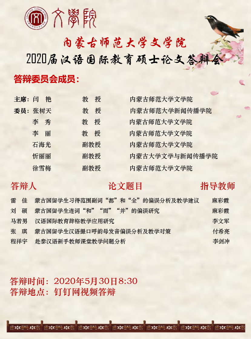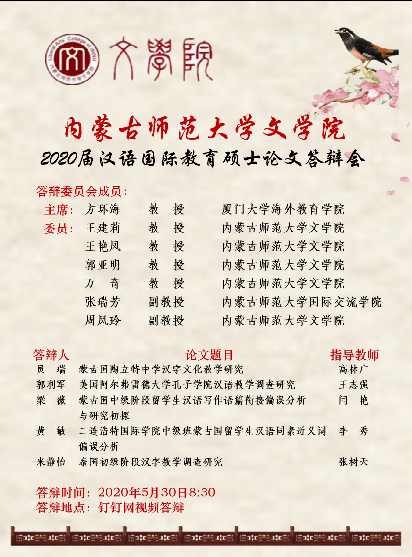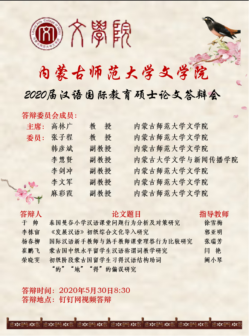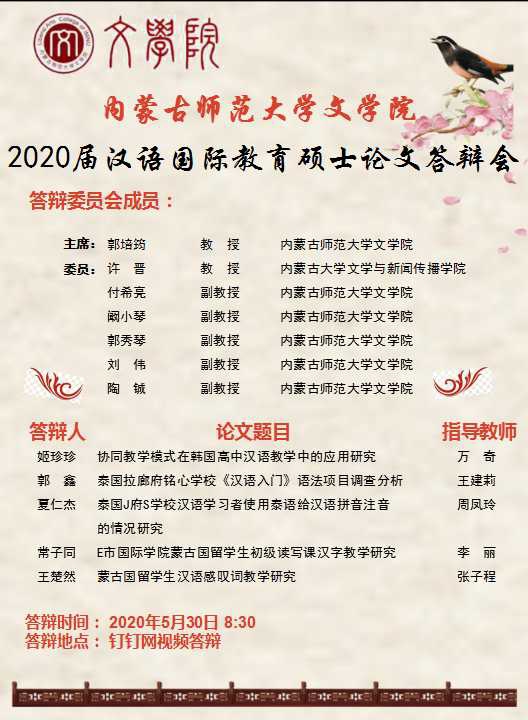 565net必赢客户端2020届汉语国际教育硕士论文答辩会宣传海报