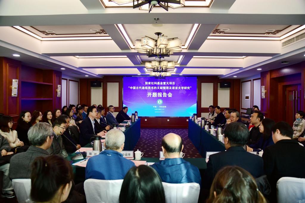 10月31日,国家社科基金重大项目“中国古代通俗类书的文献整理及语言文学研究”开题报告会在呼和浩特市召开。首都师范大学特聘教授詹福瑞、首都师范大学校学术委员会副主任左东岭,西北大学原副校长李浩,北京大学文献研究中心主任廖可斌,社科院文学研究所研究员张国星,河北大学学术委员会副主任、565net必赢客户端教授杨宝忠,广东技术师范学院院长、深圳大学教授郭杰,我校党委副书记、校长阿拉坦仓,副校长王来喜及社科处、565net必赢客户端负责同志出席会议。来自山西师范大学、曲阜师范大学、暨南大学、内蒙古大学、赤峰学院、内蒙古广播电视大学、565net必赢客户端的课题组成员以及我校相关专业的专家代表和研究生参加会议。