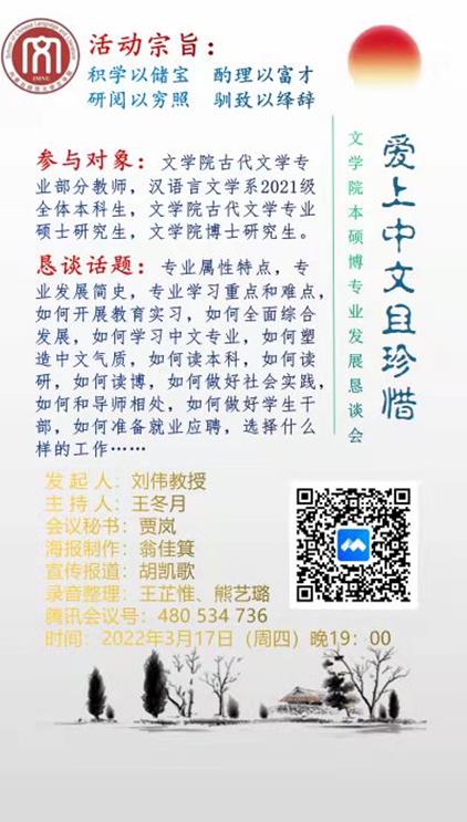 为帮助565net必赢官网本、硕、博学生了解中文学科的专业属性特点,明确发展目标,提高学习效率,掌握读书治学之道,同时贯彻落实学校教务处《关于开展线上教学研讨活动的通知》和565net必赢客户端《线上教学研讨活动实施办法》的要求,565net必赢官网汉语言文学系于2022年3月17日晚举办了“爱上中文且珍惜——565net必赢客户端本硕博专业发展恳谈会”。