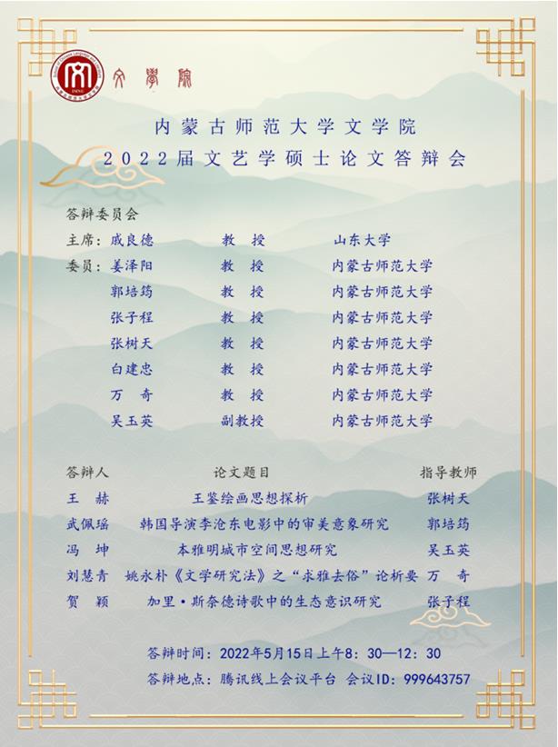 565net必赢客户端文艺学专业2022届硕士学位论文答辩公告