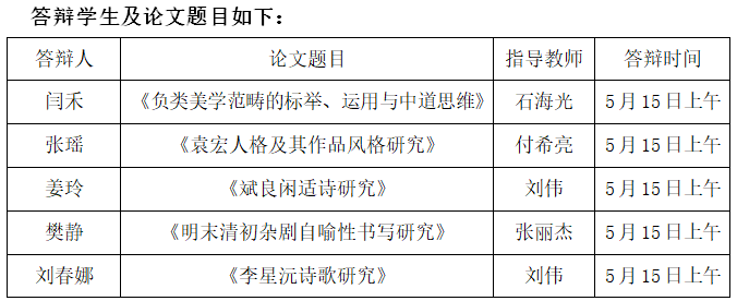 中国古代文学专业定于2022年5月15日上午(8:30-12:30)召开2022届硕士学位论文答辩会。根据学校《关于做好2022年上半年博士、硕士研究生学位授予工作的通知》《关于做好疫情防控期间2022届研究生毕业答辩工作的通知》的要求,本次答辩采用的方式为网络视频答辩,使用的远程会议软件为腾讯会议,会议号为(会议号为:605-854-312)。本次答辩会特别邀请了北京大学中文系教授、博士生导师周兴陆担任答辩主席。欢迎广大师生参加交流!