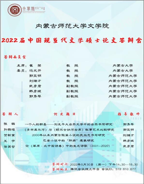 中国现当代文学专业定于2022年5月30日下午(14:30—18:30)召开2022届硕士学位论文答辩会。根据《关于做好2022年上半年博士、硕士研究生学位授予工作的通知》《关于做好疫情防控期间2022届研究生毕业答辩工作的通知》的要求,本次答辩采用的方式为网络视频答辩,使用的远程会议软件为腾讯会议,会议号为519810677。