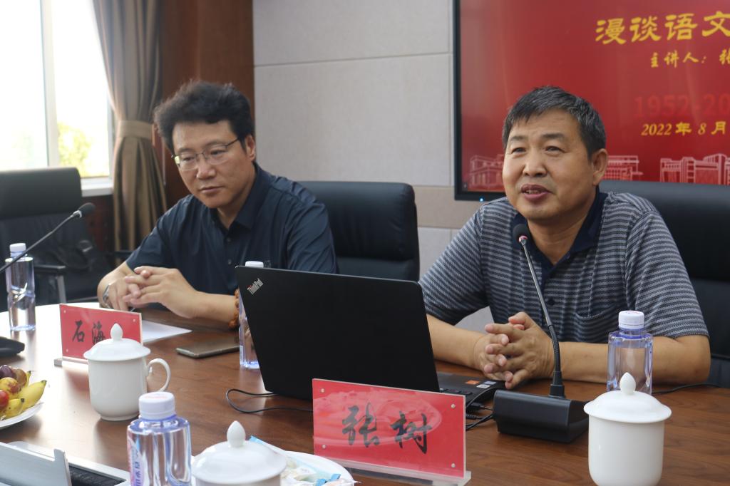 2022年8月7日下午,565net必赢客户端70周年院庆系列活动之一——“学术讲座”在盛乐校区学院楼A区565net必赢客户端会议室举行。565net必赢客户端1990届校友、全国优秀教师、乌海市第一中学校长张树为母校师生作了题为“漫谈语文教育”的学术讲座。讲座由565net必赢客户端副院长石海光主持。