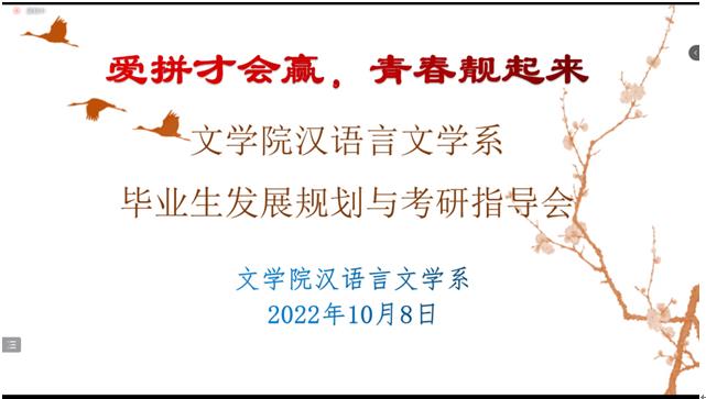 会上,刘伟教授从毕业条件自查、毕业形势研判、毕业规划设计、考研困惑答疑、毕业论文要求五个方面对毕业生进行了详细指导,他鼓励全体毕业生要脚踏实地,步步为营,在人生的道路上扬帆远航。胡素莲博士针对考研学生所关注的考纲变动、调剂策略等问题做了有针对性的指导。2022级中国古代文学专业硕士研究生王佳丽同学分享了自己的备考经验,2022级现当代文学专业硕士研究生刘佳琳同学分享了自己考研心理调适的心得体会,2019级毕业生代表卫佳同学也分享了自己推免研究生的经验。