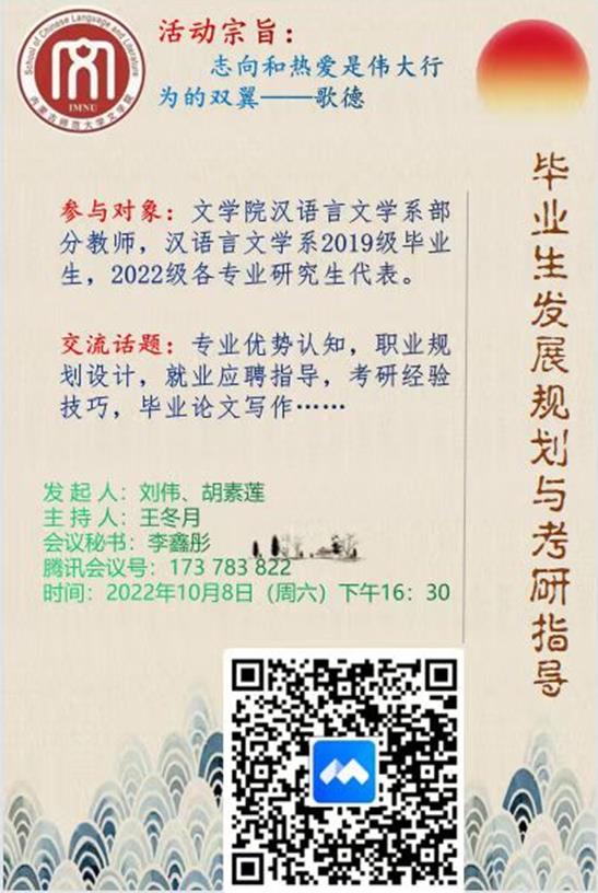 10月8日下午,565net必赢官网汉语言文学系召开毕业生发展规划与考研指导会。受新冠疫情影响,本次会议以云端线上方式进行。汉语言文学系主任、教工第一支部书记刘伟教授,汉语言文学系副主任胡素莲博士,2022级新生班主任张丽娟博士、孙亚楠博士、王雪博士,以及汉语言文学专业2019级本科生、2021级和2022级部分本科生共120余人参加了会议。