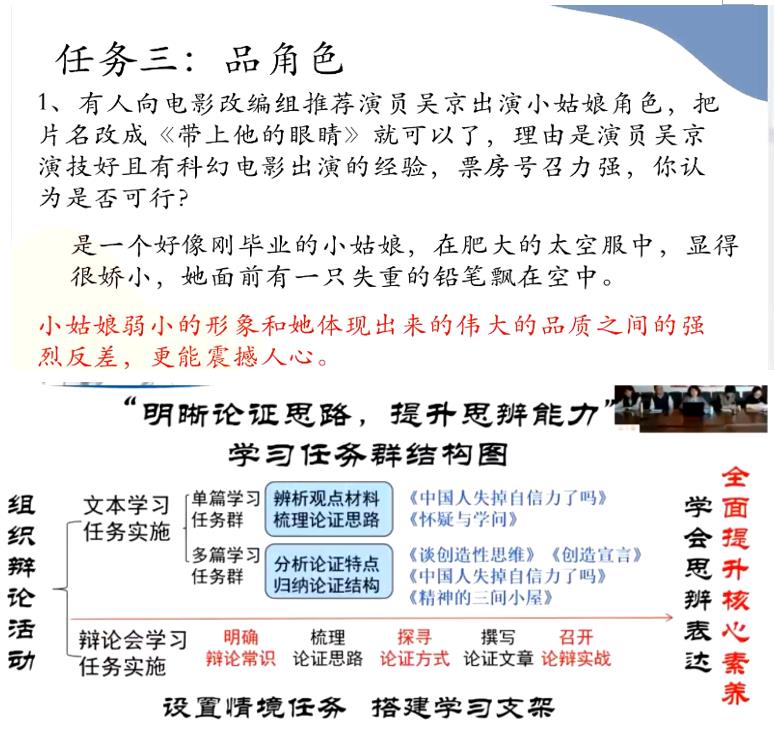 教学设计环节,王老师以传统篇目《愚公移山》和科幻小说《带上她的眼睛》的问题设计为例展开。前者提出5个问题:愚公移山难吗?难在哪里?最难的是什么?为什么要坚持移山?神话结尾的作用是什么?通过设疑提问引发学生的思考向高阶思维延伸。后者则通过小说改编电影的方式,设计三个任务:说剧情、选画面、品角色,在任务引领下的活动既有“拍电影”的艺术构思,也有对“电影脚本”的揣摩和处理,通过这些系列工作的进行让学生完成对课文的深入阅读、梳理、探究。