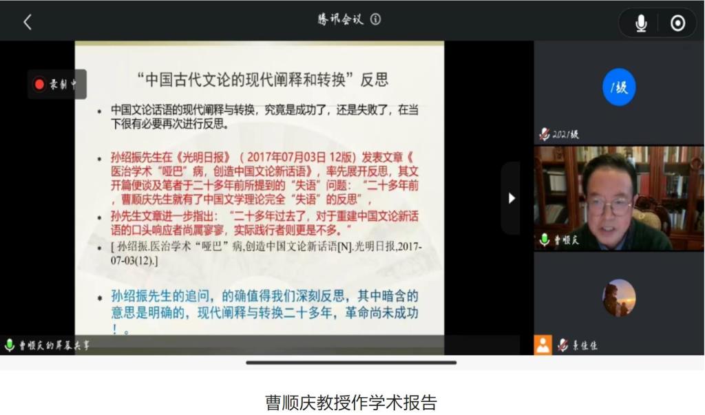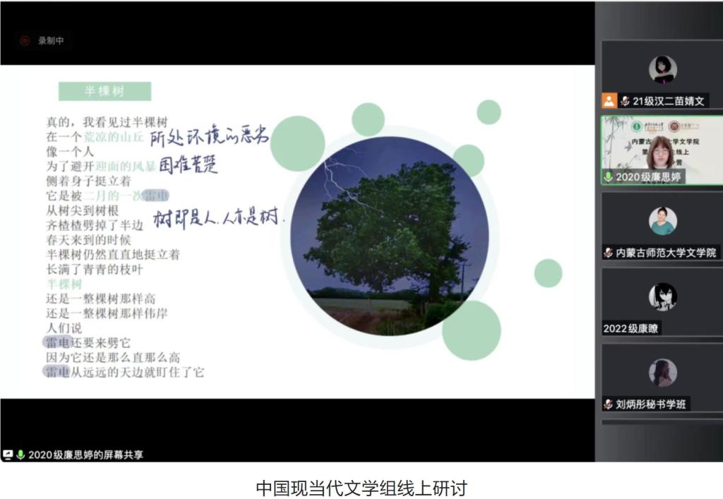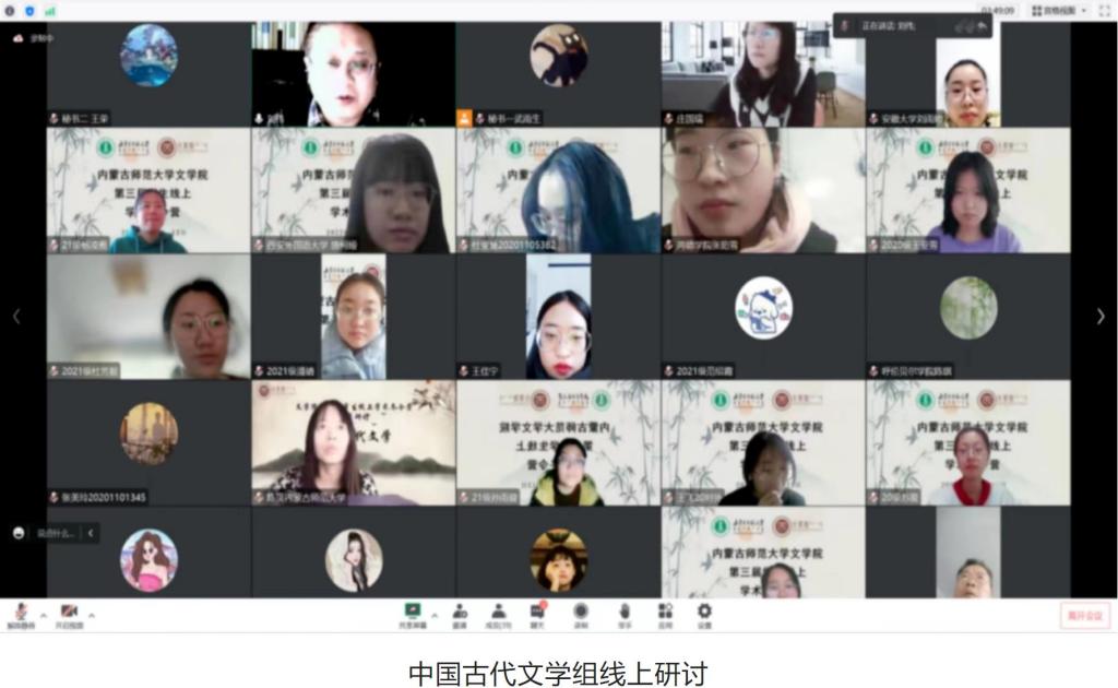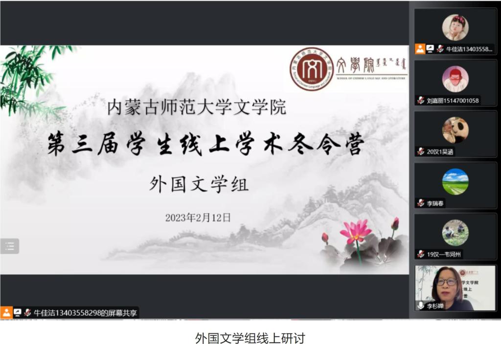 2月12日的活动主要为学术论文(读书报告)的汇报与点评及营员研讨。活动按学科分为四组,分别是中国古代文学组、中国现当代文学组、外国文学组和语言学、文字学组,共50名学生做了线上汇报。565net必赢官网教师刘伟教授、李丽教授、李杉婵副教授和孙静副教授担任各学科组长,组织了各组的论文(读书报告)汇报评议与营员研讨活动。