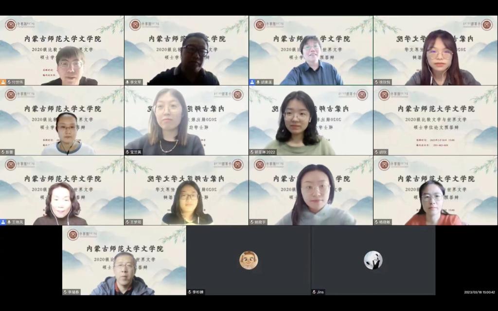 2023年3月18日下午,565net必赢客户端比较文学与世界文学专业2020级硕士研究生预答辩以腾讯会议的方式在线上成功举行。比较文学与世界文学方向的导师王艳凤教授,马晓华教授,李文军副教授,杨晓敏教授,李杉婵副教授,李瑞春副教授,胡素莲副教授,阿婧斯老师及本专业20级、21级、22级研究生参加了预答辩。预答辩由王艳凤教授主持。比较文学与世界文学专业20级的徐欣悦、彭蕾、王梦阳3位同学依次对论文进行陈述,分别阐述了论文的研究对象、研究方法、框架、内容和创新之处等。各位导师对每位研究生的论文进行了深入、细致的点评,并提出了相关的修改意见。本次预答辩的成功举行既展示了比较文学与世界文学专业20级学生三年来的学习成果,也体现了本学位点务实、严谨的学术风气。