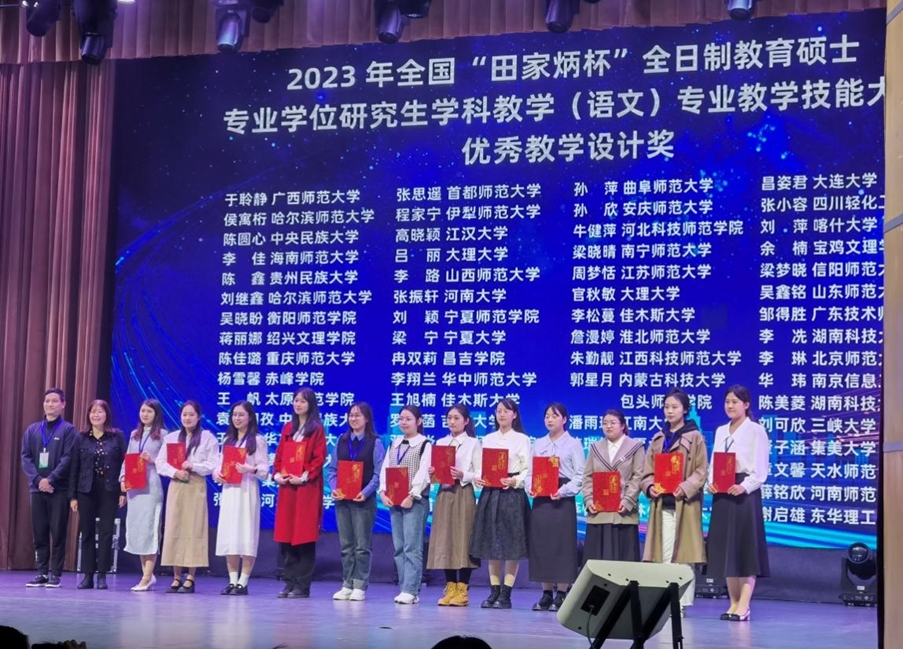来自全国107所院校的499名选手参加初赛,通过遴选,153名选手进入最后的决赛。565net必赢官网选派2022级学科教学(语文)的韩娟、王越两位同学参赛,两位同学凭借扎实的教学基本功,在比赛中脱颖而出,韩娟荣获二等奖,王越荣获优秀教学设计奖,刘伟老师荣获“优秀指导教师”奖。