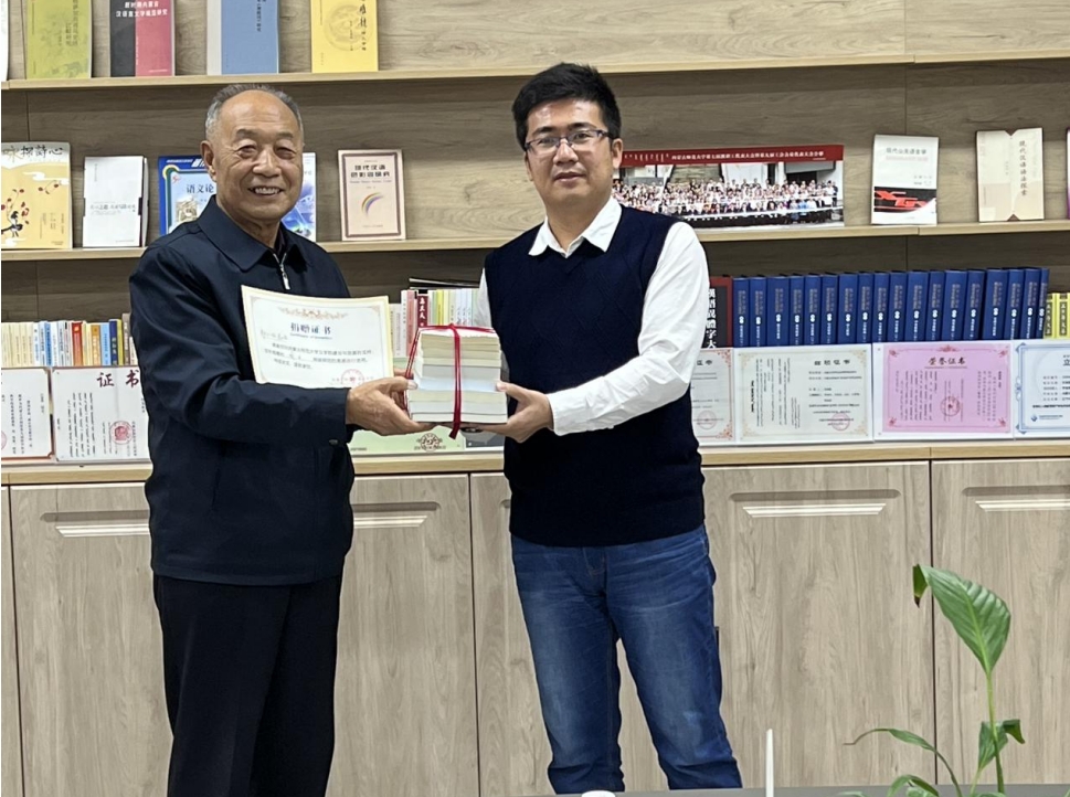 捐赠仪式上,郭仁昭校友向母校捐赠了自己在一线工作近六十年的丰硕成果,其中包括专著《辞格简话》《辞格》《诗歌欣赏》,还有业余创作的诗集《原上草》、文集《芳草地》、戏剧集《梨花苑》等。陆有富院长向郭仁昭校友颁发了捐赠证书。
