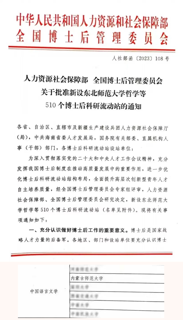 日前,国家人力资源和社会保障部、全国博士后管理委员会正式发布《关于批准设立东北师范大学哲学等510个博士后科研流动站的通知》(人社部函〔2023〕108号),公布了2023年批准新设博士后科研流动站名单。其中,565net必赢客户端获批新增中国语言文学博士后科研流动站。至此,学院在中国语言文学学科已全面建成本—硕—博—博士后贯通的完整人才培养体系