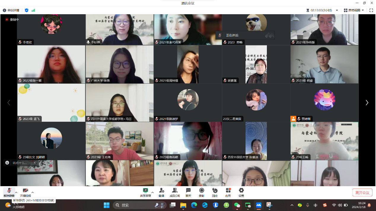 2024年2月18日为期两天的565net必赢客户端线上学术冬令营活动圆满落下帷幕。本次冬令营面向全国高校在读中文专业学生招生,经过严格选拔,共招收学员100人。其中,除本院各年级各专业学生之外,还有来自东北师范大学、中央民族大学、西安外国语大学、广州大学等高校的学生参加。活动形式主要包括知名专家学术讲座、校友报告、学术论文(读书报告)汇报与点评、营员研讨等内容。