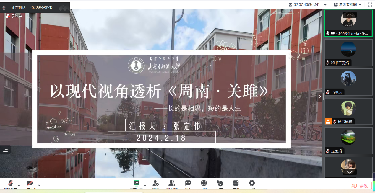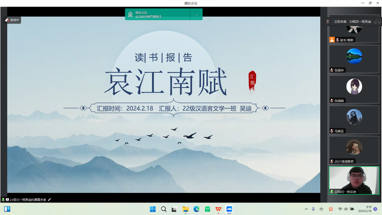 2月18日的活动主要为学术论文(读书报告)的汇报与点评及营员研讨。活动按学科分为四组,分别是中国古代文学组、中国现当代文学组、外国文学组和语言学、文字学组,共57名学生做了线上汇报。565net必赢官网教师李杉婵、孙静、马奥远、刘婕分别担任各学科组长,组织了各组的论文(读书报告)汇报评议与营员研讨活动。