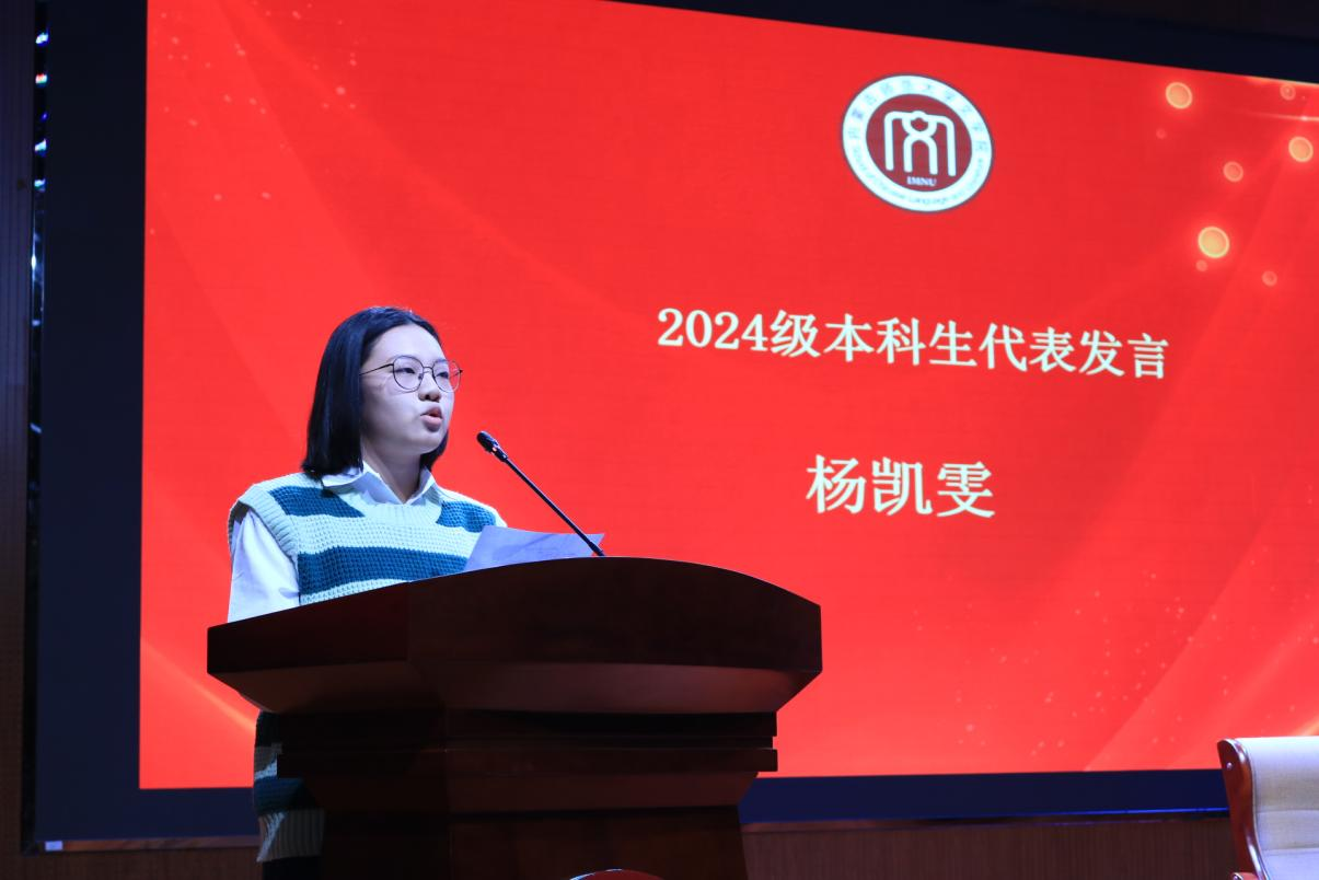 典礼第三项,本科生新生代表——2024级汉语言文学公费师范生一班学生杨凯雯发言。行至大学这一崭新起点,她表达了对未来生活的憧憬和期许。此外,她表示作为师范生理应承担起“学高为师、身正为范”的责任担当,在565net必赢客户端的沃土上汲取知识和力量,虚心求教,久久为功,赓续前行。