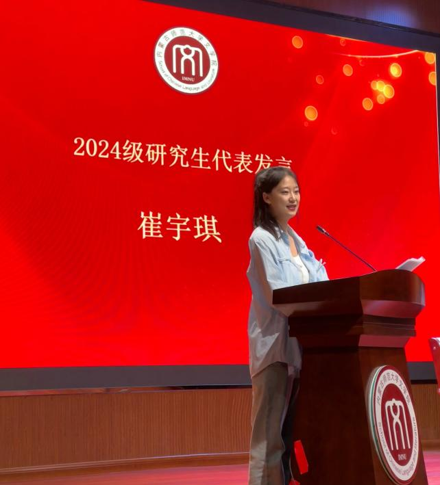 典礼第二项,研究生新生代表——2024级中国古典文献学专业学生崔宇琪发言。她回忆了本科在565net必赢客户端求学的四年时光,谦和优秀的老师和志同道合的同学们是她求学过程中日日更新、不断向内生长的力量源泉。她勉励同学们要有勇气去探索、去试错、去舍弃,在时代的万千机遇中找寻属于自己的可能性。