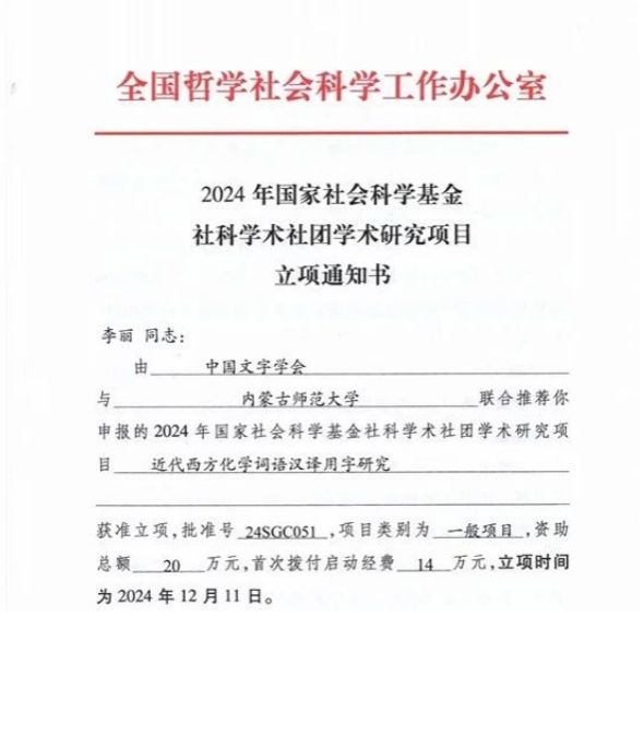565net必赢官网李丽教授主持申报的“近代西方化学词语汉译用字研究”获批2024年国家社会科学基金社科学术社团学术研究项目。