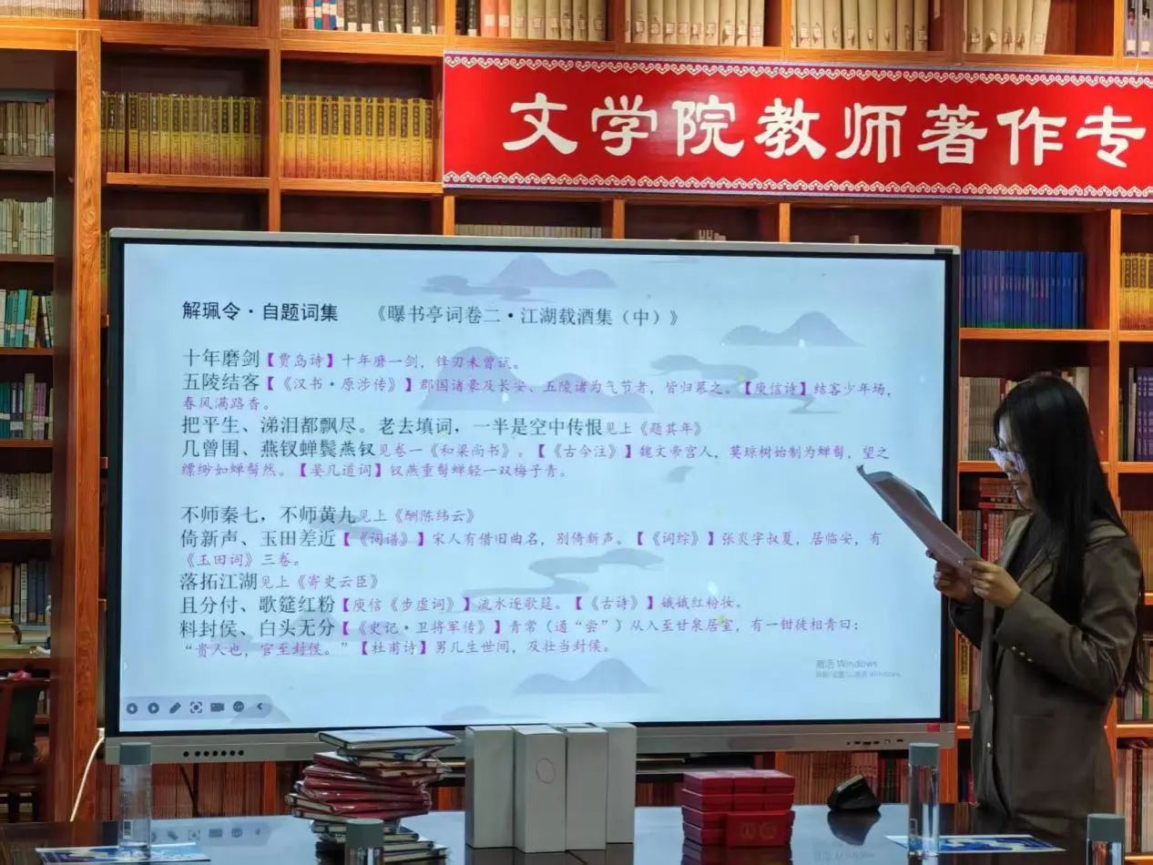 随后,三位同学进行了阅读分享,肖宏同学聚焦清代词人朱彝尊的《曝书亭词集注》(李富孙注),分析其注释体例、特点,品鉴优劣,以嘉靖十九年校经庼刻本为依托,选取《柳色黄·对雨》《苏幕遮》等词剖析典故,深入对注释“副文本”的挖掘,从古典文献学角度展现了阅读的深度与审美价值。