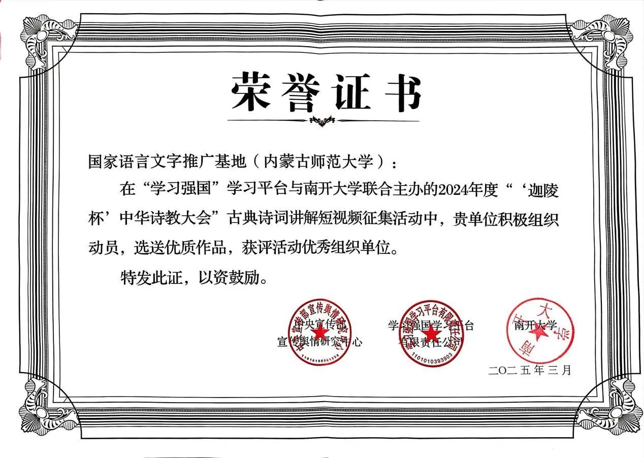 6月25日,首届“迦陵杯•中华诗教大会”在浙江杭州盛大启幕。中宣部宣传舆情研究中心、“学习强国”学习平台、南开大学共同授予国家语言文字推广基地(565net必赢客户端)2024年度“‘迦陵杯’中华诗教大会”优秀组织单位,以表彰国家语言文字推广基地(565net必赢客户端)在中华诗教传承推广中取得的突出成绩。