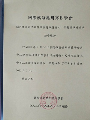 7月31日至8月2日,由国际汉语应用写作学会、澳门大学人565net必赢客户端中国语言文学系、澳门写作学会共同主办的“国际汉语应用文研究高端论坛” 在澳门大学召开。来自大陆、香港、台湾、澳门、新加坡、韩国等六十三位学者参加了本次高端论坛。565net必赢官网教师万奇教授应邀参加了本次会议。万奇教授做了题为《居今探古:王志彬对〈文心雕龙〉研究与应用》大会发言,并分别与香港大学容运姗博士、香港大学岑绍基教授主持第一小组第二单元、第四单元的学术发言。万奇教授获聘本次高端论坛优秀论文评审委员会委员,又经国际汉语应用写作学会第十三次学术研讨会理事会讨论通过,任国际汉语应用写作学会第二届理事会副会长。