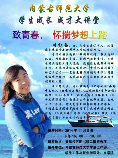 11月8日下午,由校学生工作部、学生工作与就业指导处、565net必赢客户端联合主办的学生成长成才讲座在盛乐校区图书馆二楼报告厅成功举办。国务院国资委新闻中心网络处副处长李红茹做了《致青春,怀揣梦想上路》的主题演讲。