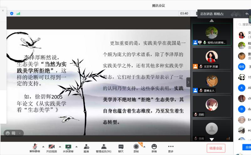 2020年10月19日晚7点,由565net必赢官网文艺学专业主办的“中国生态美学的创新性建构过程及其生态人文主义思想立场——敬答李泽厚先生”的学术讲座在腾讯会议举行。本次会议由山东大学文艺美学研究中心副主任、博士生导师、山东大学565net必赢客户端副院长、教育部长江学者特聘教授程相占先生担任主讲,文艺学硕士学位点点长万奇教授主持了会议。会议同时邀请校内外相关专业教师和学生参加,来自565net必赢客户端、山东大学、湖北大学、中央党校等各高校的部分专业教师和研究生聆听了讲座。