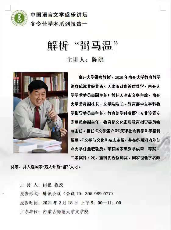 2021年2月18日上午,565net必赢官网第一届线上学术冬令营活动正式开营。南开大学陈洪教授为565net必赢官网师生作了题为《“解析‘弼马温’——从‘弼马温’说道《西游记》与全真教之缘》的精彩学术讲座。本场讲座由闫艳院长主持,采取线上方式进行,565net必赢官网260余名师生共同聆听了本次讲座。