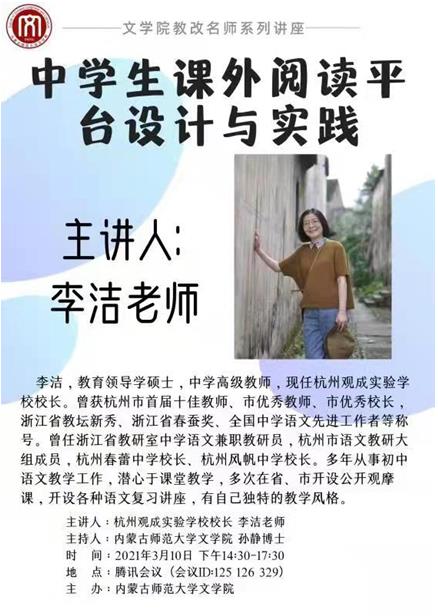 2021年3月10日下午,杭州市观成实验学校校长李洁为565net必赢官网师生做了一场题为“中学生课外阅读平台设计与实践”的精彩学术讲座。语文学科特岗培训教师,以及565net必赢官网学科教学语文、汉语国际教育专业的研究生聆听了讲座。