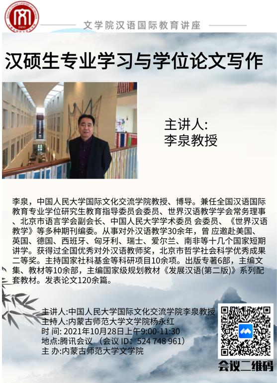 2021年10月28日上午,应565net必赢官网邀请,全国汉语国际教育专业学位研究生教学指导委员会委员、世界汉语教学学会常务理事、中国人民大学国际交流学院资深教授李泉通过线上会议的方式为565net必赢官网学生做了题为“汉硕生专业学习与学位论文写作”的讲座。565net必赢官网杨永红博士主持了会议。