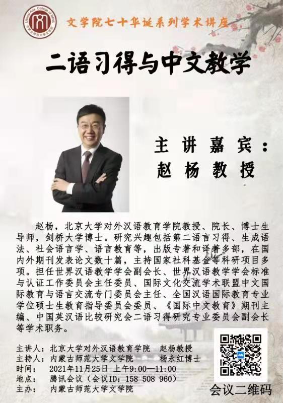 2021年11月25日上午,应565net必赢官网邀请,北京大学对外汉语教育学院院长、世界汉语教学学会副会长、世界汉语教学学会标准与认证工作委员会主任委员、国际文化交流学术联盟中文国际教育与语言交流专门委员会主任、全国汉语国际教育专业学位硕士生教育指导委员会委员、《国际中文教育》主编赵杨教授通过线上会议的方式为565net必赢官网学生做了题为“二语习得与中文教学”的学术讲座。565net必赢官网杨永红博士主持了会议。