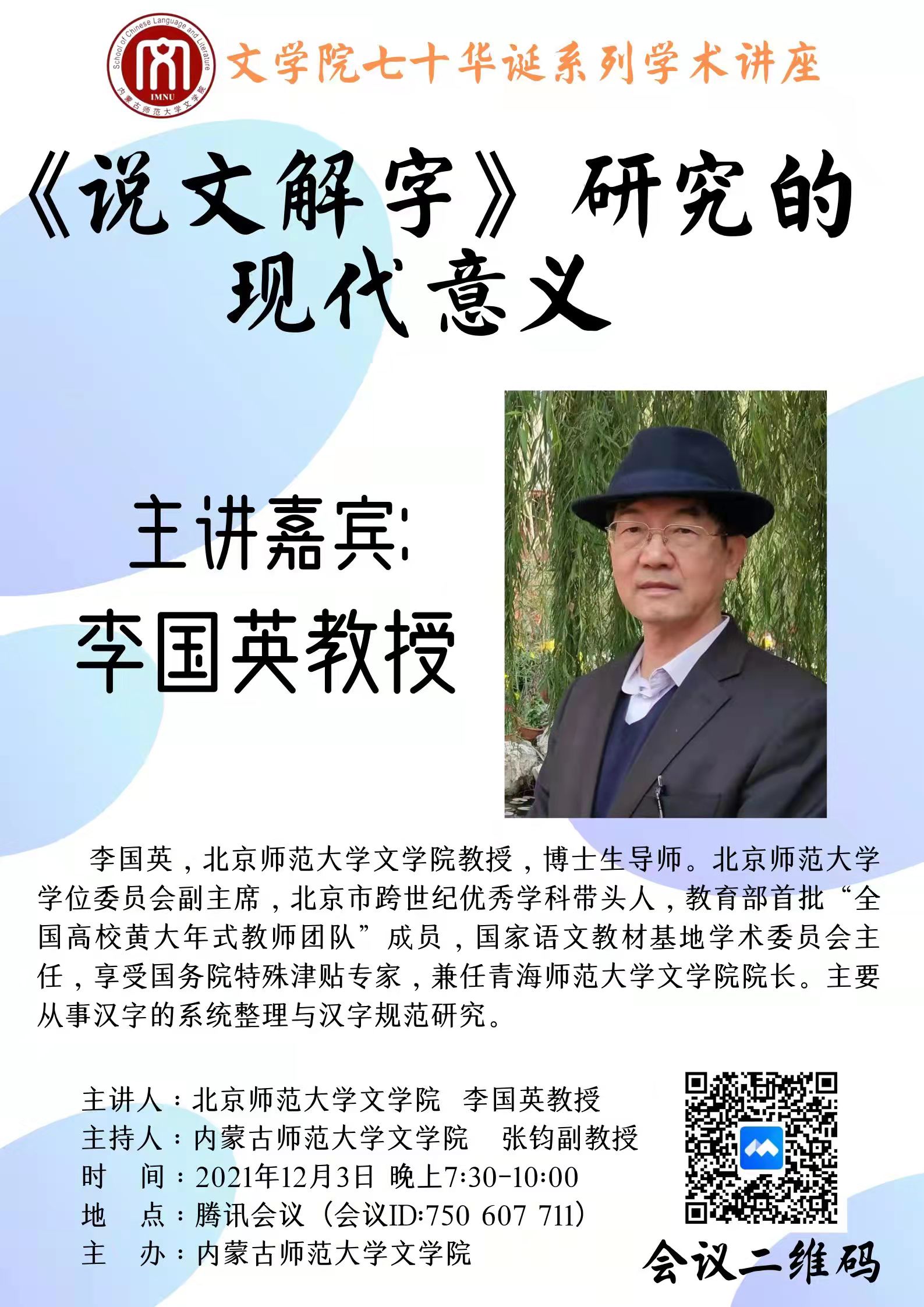 2021年12月3日晚上,应565net必赢官网邀请,北京师范大学565net必赢客户端教授、博士生导师、中国文字学会常务理事、国家语文教材基地学术委员会主任、享受国务院特殊津贴专家李国英教授为565net必赢官网师生作了题为“《说文解字》研究的现代意义”的学术讲座。讲座由张钧副院长主持,565net必赢客户端130多位师生通过“腾讯会议”平台聆听了此次讲座。