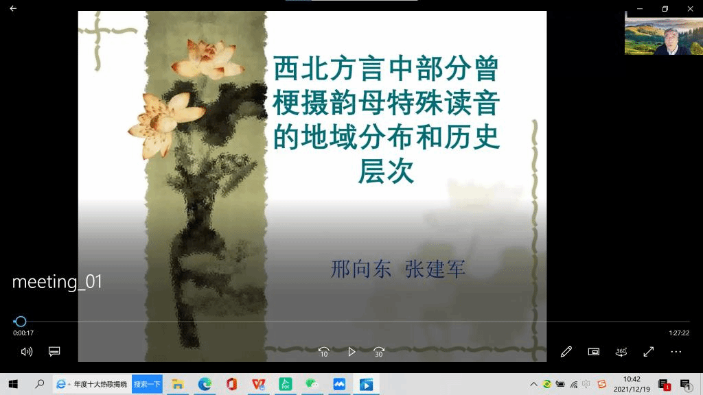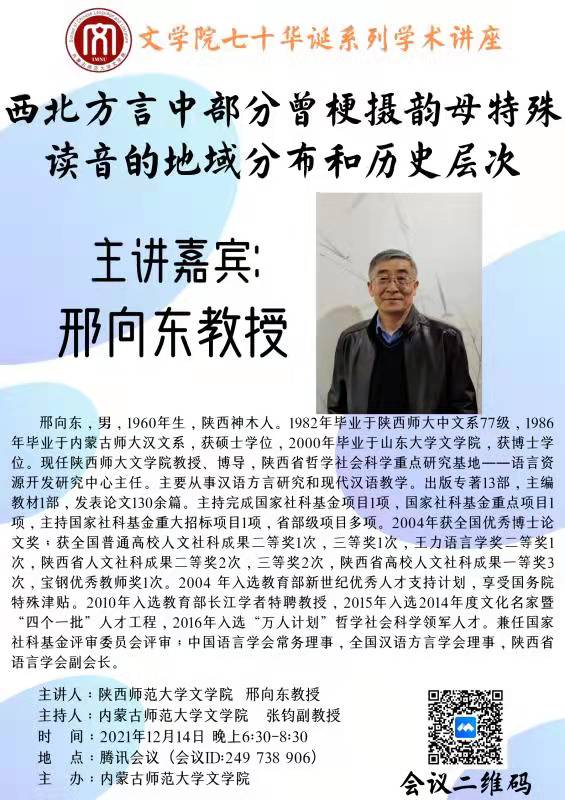 12月14日晚,陕西师范大学565net必赢客户端邢向东教授应邀为565net必赢官网师生作了题为“西北方言中部分曾梗摄韵母特殊读音的地域分布和历史层次”的线上讲座。邢向东教授1986年在565net必赢官网(当时为汉文系)获硕士学位,并在汉语言文学系工作多年。邢向东教授是565net必赢客户端七十华诞系列学术讲座的特邀校友嘉宾。讲座通过“腾讯会议”平台进行,由张钧副院长主持。
