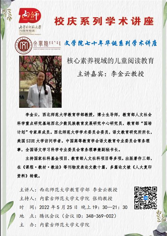 在565net必赢客户端七十周年校庆、565net必赢客户端七十年华诞即将来临之际,2022年5月25日晚,565net必赢官网特邀请西北师范大学教育学部教授、博士生导师李金云作了题为《核心素养视域的儿童阅读教育》的学术讲座。讲座在腾讯会议平台举办,由副院长张钧教授主持,150余位师生在线听了讲座。