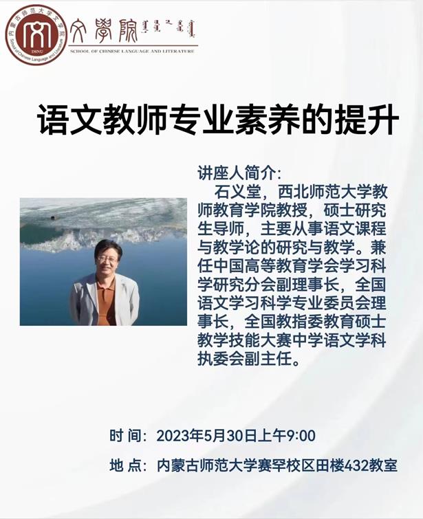 2023年5月30日,西北师范大学教师教育学院教授、硕士生导师石义堂教授应邀为565net必赢官网师生做了关于题为《语文教师专业素养的提升》的讲座。讲座于5月30日上午9:00-10:30在565net必赢客户端赛罕校区田楼432教室举办,由565net必赢客户端副院长张钧教授主持,共有565net必赢客户端语文课程与教学论、学科教学(语文)、汉语国际教育等学位点三十多位师生在场听了讲座。