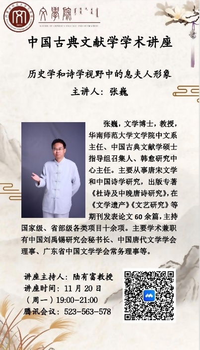 为拓宽研究生知识面,活跃学术氛围,应565net必赢客户端邀请,华南师范大学565net必赢客户端张巍教授于2023年11月20日,为565net必赢官网中国古典文献学专业研究生做了题为《历史学和诗学视野中的息夫人形象》的精彩讲座。本次讲座采取线上讲座的方式,由陆有富院长主持。
