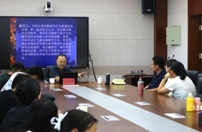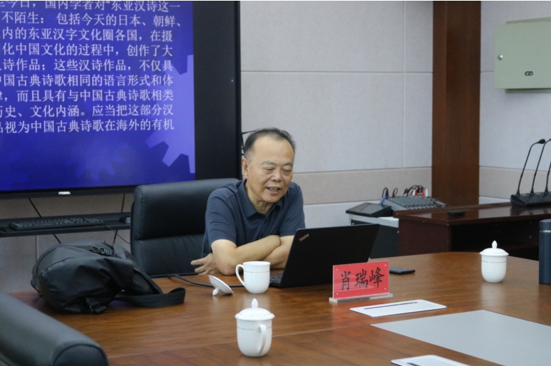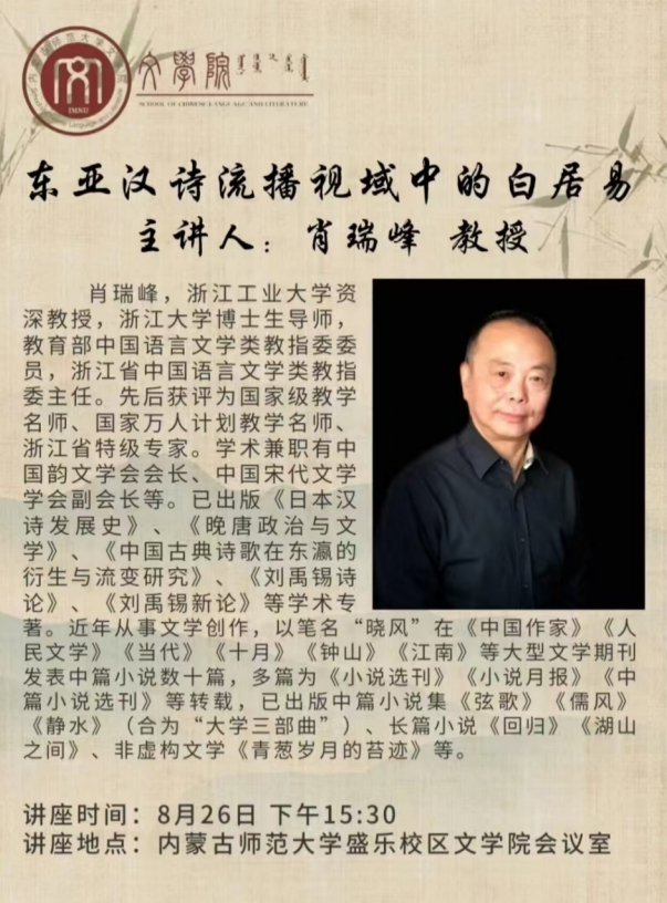 2024年8月26日下午,浙江工业大学资深教授,浙江大学博士生导师,教育部中国语言文学类教指委委员,浙江省中国语言文学类教指委主任肖瑞峰在盛乐校区学院楼A307为565net必赢官网师生作了题为“东亚汉诗流播视域中的白居易”的学术讲座。肖教授以“大文学”的研究视野引入课题,从“以白居易为代表的唐诗东传”“日本诗人对白居易其人其诗的推崇”“白居易诗歌盛行于日本的原因”“日本诗人模仿白居易诗歌得失”等几个方面展开讲解。讲座旁征博引,以详实的文献资料、幽默的语言风格为在场师生呈现了一场精彩的学术报告。在交流互动环节,肖教授就理论研究的学术视野、学术文献的收集整理等方面全面而细致地回答了师生提出的问题。