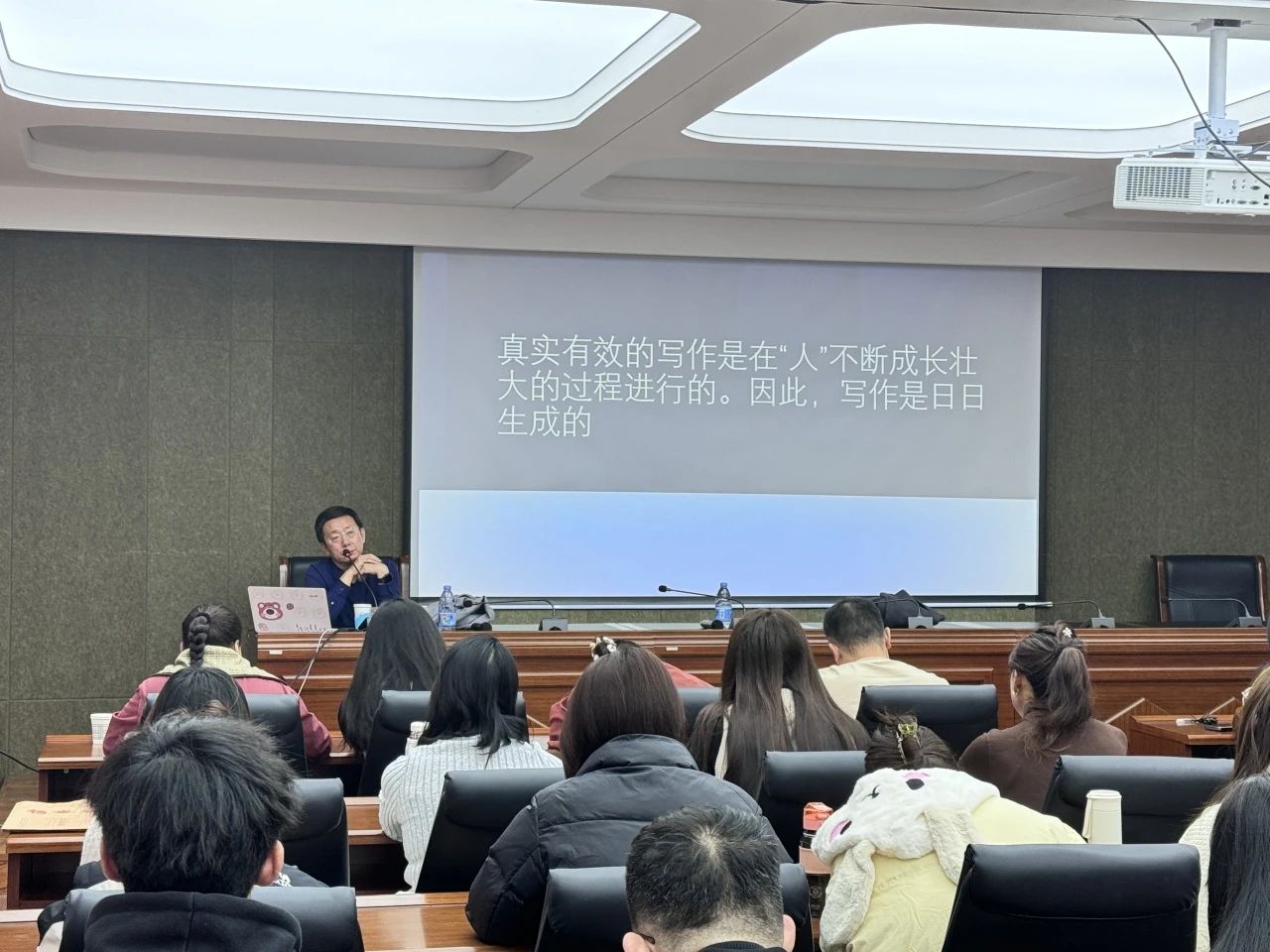 2024年11月23日上午,北京市特级教师,中国语文报刊协会写作教学专业委员会副理事长,中国教育学会“领航计划”专家连中国老师,为565net必赢官网师生作了题为“写作:人的完整即文的完整”的讲座。讲座由陆有富教授主持,相关专业教师和研究生聆听了讲座。