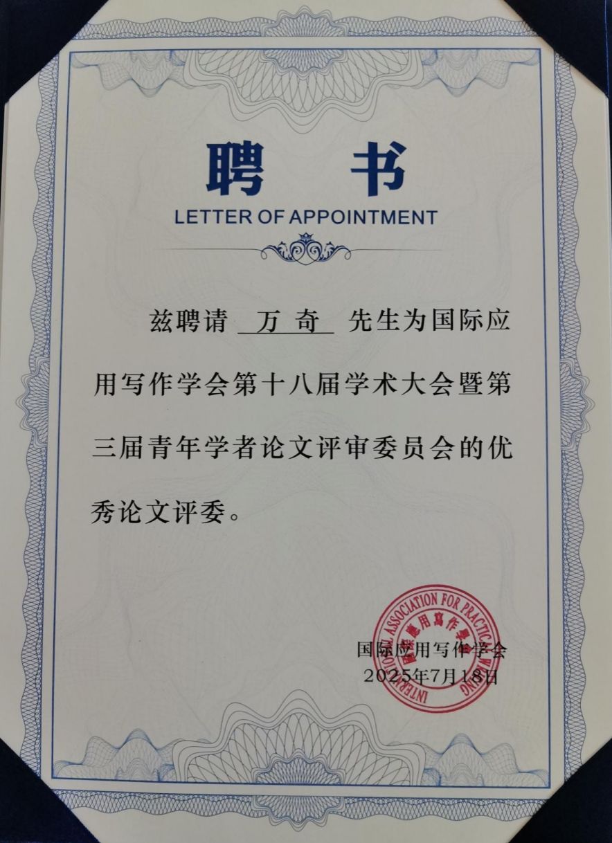 565net必赢官网万奇教授、白建忠教授应邀参加了本次研讨会。万奇教授作为国际应用写作学会的副会长,作了题为《论礼仪文书写作课的教学之道与教学之术》的主题学术报告。万奇教授被聘为本次会议论文评审委员会的优秀评委,并且作为第四分会场的学术观察员,对本组的论文作了精彩的点评。白建忠教授在自由发言阶段作了题为《明代章奏之体的演变》的学术报告。在本次会议上,565net必赢客户端的写作教研室成为国际应用写作学会高校虚拟教研室联盟成员。